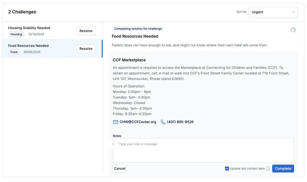 Connecting for Children and Families runs an internal program called CCF Marketplace. When an individual identifies as food insecure, a challenge called “Food Resources Needed” emerges. This challenge has a number of associated solutions, one of which is: “CCF Marketplace”.
