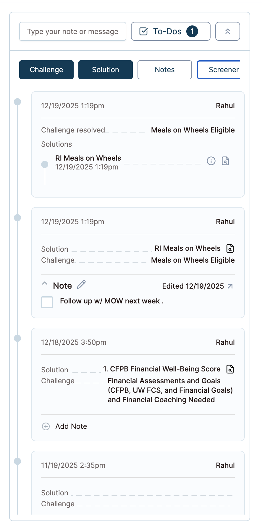 This guide explains how the Timeline works, how notes are created, and how challenges, solutions, and screeners automatically appear.